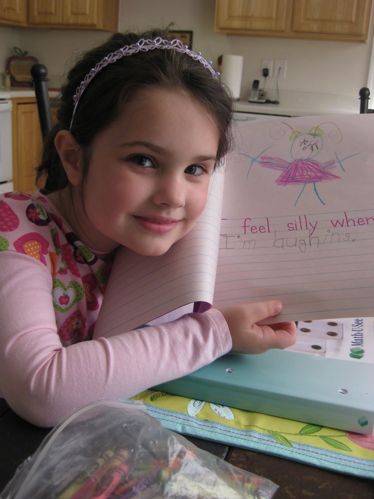In homeschool, we have been working on a book about feelings. It has been so much fun! Emma Grace and I have had great discussions about what makes us feel happy, excited, sad, etc. She has been enjoying this little creative writing unit very much! Each day, we have written a sentence and illustrated a picture about one of our feelings. Yesterday, the feeling was 'silly'. As I was watching Emma Grace draw a picture of herself being silly, I had to smile. She told me, "Mommy, I am drawing my eyes closed in this picture because I am laughing SO hard!". I love her attention to detail! What really struck me, though, was the way she even drew her tummy and arms- only to later color over her careful artwork by drawing the clothes. (If you look closely at her drawing, you'll see what I'm talking about. She could have easily only drawn a head, dress and legs... but she drew her whole body and then colored on top of it.) Wubs' drawing convicted me as I thought about an honest picture of myself. If I were to add up the time I take selecting and ironing my outfit, putting on makeup, and styling my hair... would it be as much time as I spend in my daily quiet time with the Lord? Some days, I could say yes. Other days, I know I take much more time working on my outside appearance rather than the condition of my heart. How appropriate that Wubs picture of 'silly' made me realize how silly I can be! It's VERY silly that I wouldn't walk out our front door without mascara but I would face the day without spending time in God's word. So, next time you see me, if my hair is a little messy or my shirt has a few wrinkles, I hope you'll rejoice with me! It will mean I spent some extra time working on the inside! wink!